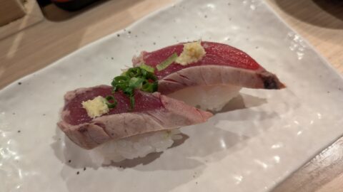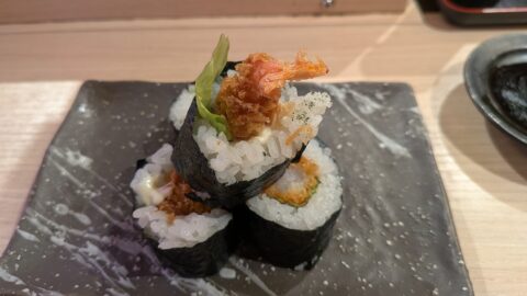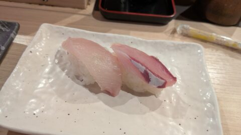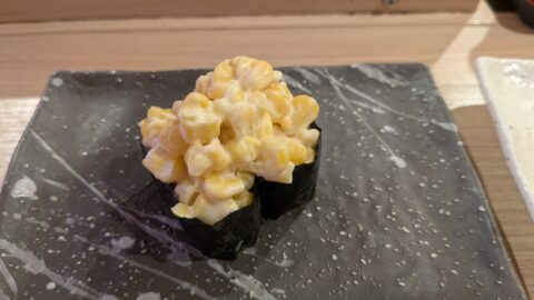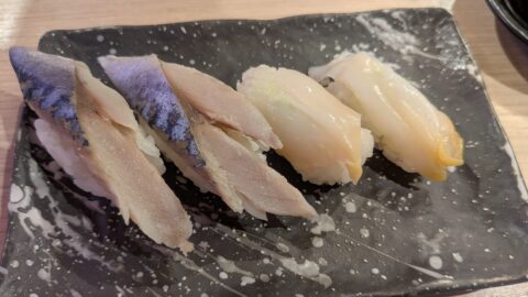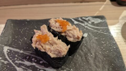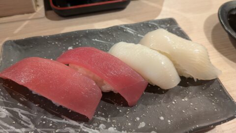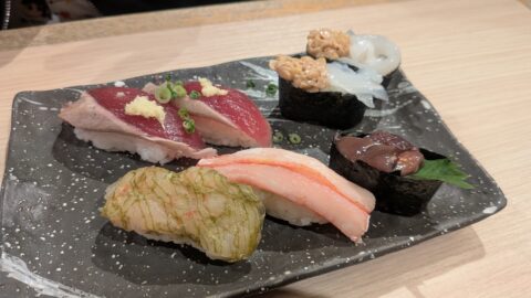 回転レーンから運ばれてくるのは同時で注文すると角皿に数種類まとめて盛り付けられるのはすごく違和感です。見た目は綺麗けど誰が注文したネタ?ってなるので私はここの提供方法は慣れませんでした。複数人で一気に注文するとわかりにくいです。