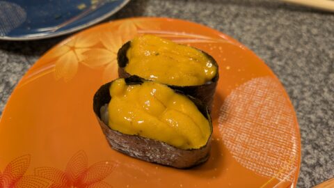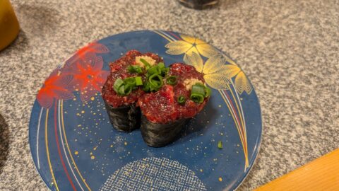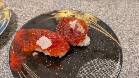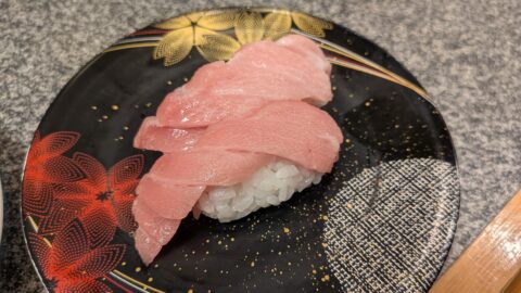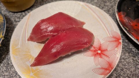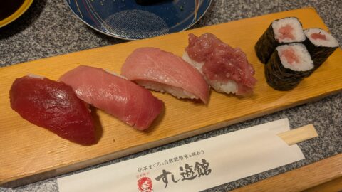タッチパネルで「マグロの5種盛り」を注文しました。これは岡山にもある絶対に注文したほうが良いと言われていた一品です。中トロ、赤身のバランスが絶品です。これだけを食べ続けたいぐらい旨いです。